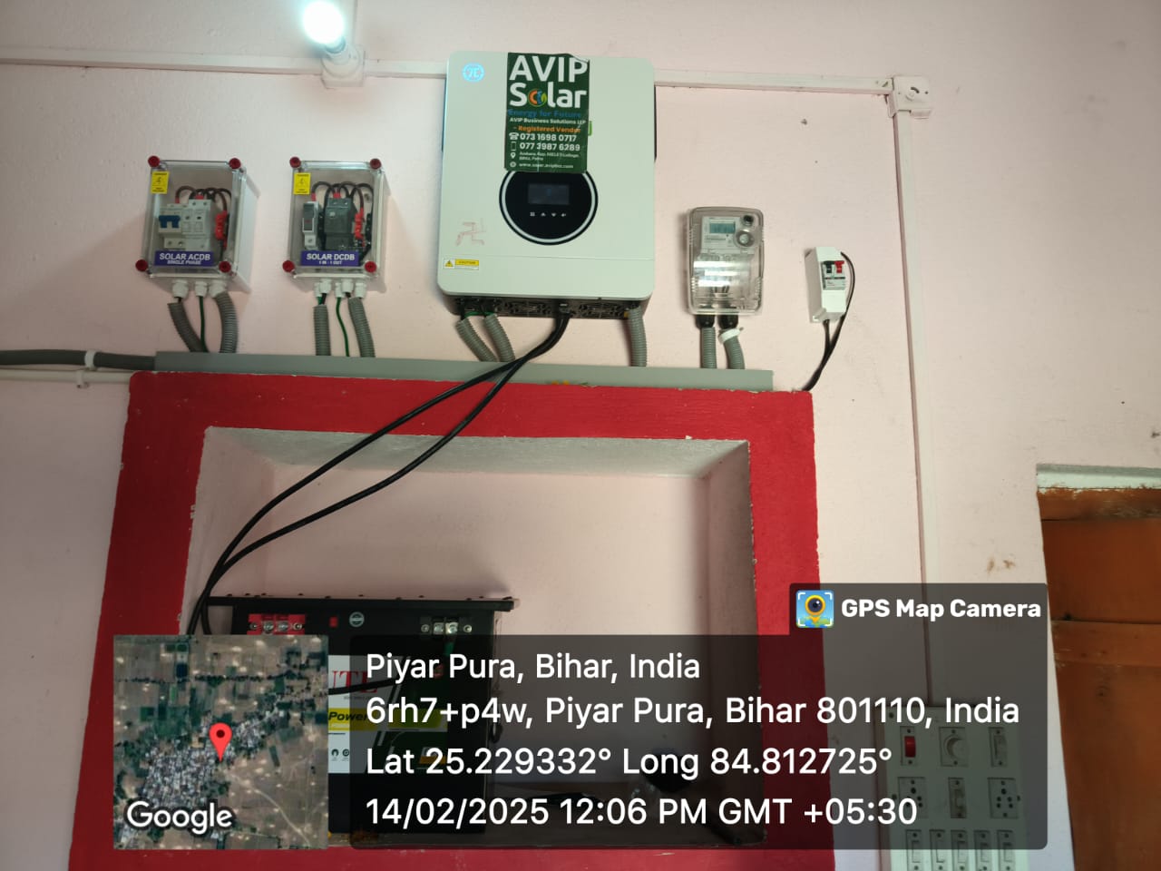 A 3kw Hybrid Solar system with a 24v Lithium Battery has been installed at Piyarpura village, near Kinjar block. This system ensures smooth functioning even during long daytime power cuts. Hybrid inverter of GOOTU company was deployed with 2 power outputs.